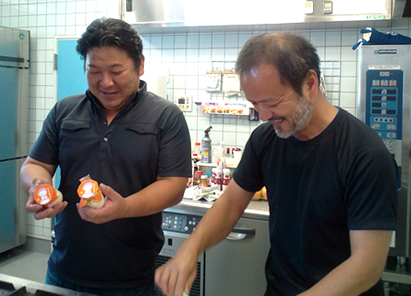 そこで、全国から選りすぐりのスイーツを集めた催事などを運営するコーポレートプレスメントのチーフアドバイザー名畑嘉政氏が、ヤフー・楽天お取り寄せ部門No.1の販売実績がある「はなしがい」たまごを生産・販売するしゅりの里と、渡辺シェフ両者を引き合わせ、「はなしがい」たまごを用い、安全・安心で人に勧めたくなるようなおいしいお菓子を作ろうとプロジェクトがスタートしました。